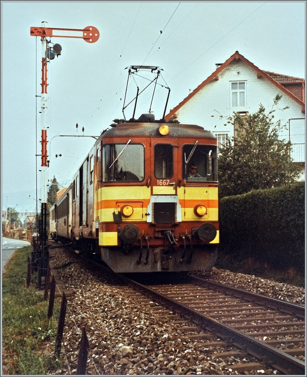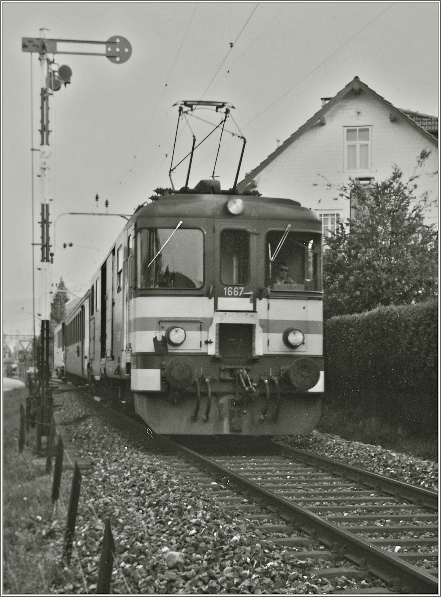 An etwa derselben Stelle wie beim vorangegangen Bild konnte vor gut vierzig Jahren dieser De 4/4 1670 beim rangieren in Vallorbe fotografiert werden. Der Zug kam aus dem Vallée de Joux und führte auch den links im Bild zu sehenden Postwagen mit. Zu jener Zeit verfügte die PBr kaum über eigenes Rollmaterial und die (kurzen) Züge wurden von der SBB gestellt.