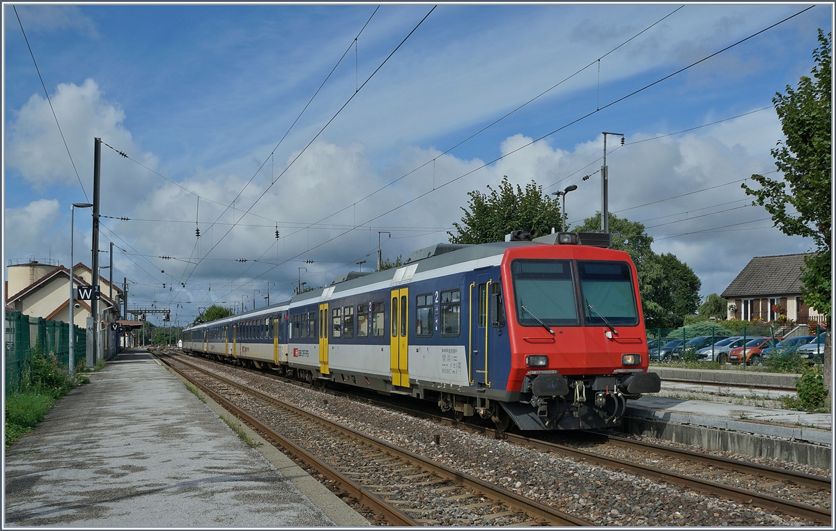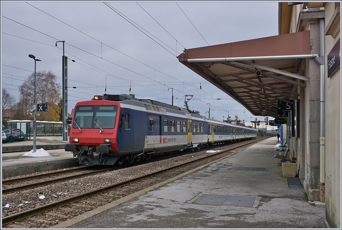 Der RE 18123 von Frasne (10:53) nach Neuchâtel (11:53) erreicht Pontarlier. Der Zug besteht (von hinten nach vorne) aus folgenden Fahrzeugen: RBDe 560 004-2, AB 50 85 30-35 603-1, B 5085 20-35 600-9, B 85 20-35 602-5 und dem führenden Bt 50 85 29-35 952-5.