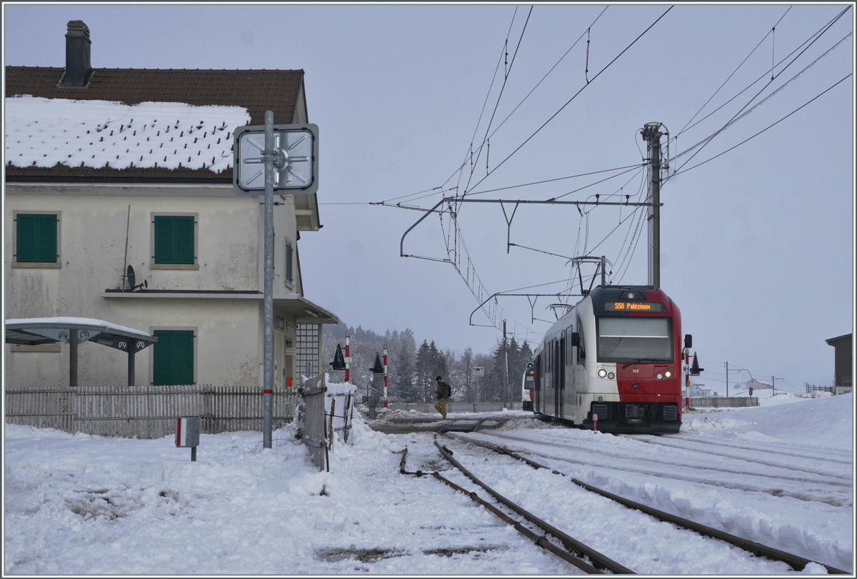 TPF Normal- und Schmalspur in Bulle mit dem Be 2/4 103 nach Gruyère und einem TPF RBDe 560 "Domino" nach Bern.