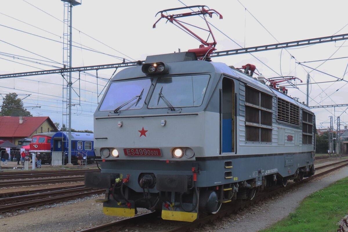 Sonderzug mit ES499 0001/350 001 steht am Abend von 27 September 2025 mit ein Retro-Rychlyk in Benesov u Prahy abfahrtbereit für ein Rundfahrt nach Prag.