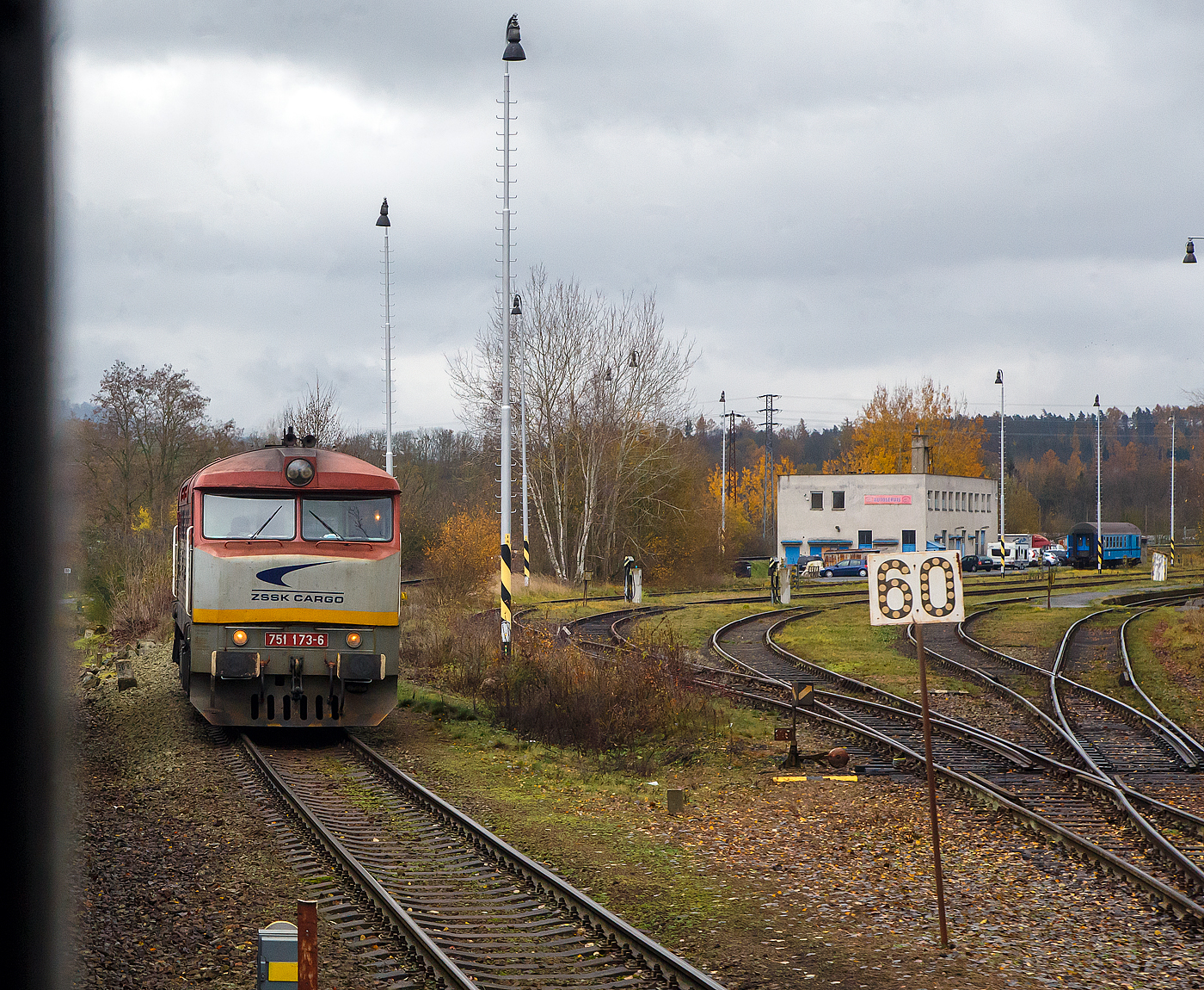 Wir erreichen am 24.11.2022 mit dem EC 360 / Ex 6 (Praha – Plzeň - Furth i.W. - Schwandorf – Regensburg – München) nun den Bahnhof Doma¸lice (Taus) an der „Böhmische Westbahn“ Bahnstrecke Plzeň–Furth im Wald (S´DC 180), während rechts die ZSSK Cargo 751 173-6 als Lz über die Bahnstrecke Janovice nad Úhlavou–Doma¸lice (S´DC 185) ankommt. Die Kursbuchstrecke S´DC 185 von Janovice nad Úhlavou nach Doma¸lice (deutsch Janowitz an der Angel – Taus) ist Teil der ehemaligen Böhmisch-Mährische Transversalbahn der ehemaligen k.k. österreichischen Staatsbahn (kkStB), sie verlief von der damaligen ungarischen Grenze am Vlarapass bei Uherské Hradi¨tě (Hradisch) nach Doma¸lice (Taus) und hatte dort Anschluss an bayerische Strecken. Die ZSSK Cargo 751 173-6, ex ČSD-Baureihe T 478.1, ist eine dieselelektrische Universallokomotive der ehemaligen Tschechoslowakischen Staatsbahnen (ČSD). Die Lokomotiven prägten ab den 1960er Jahren den Streckendienst auf nichtelektrifizierten Strecken der ČSD und galten auf Grund ihrer Zuverlässigkeit als eine der erfolgreichsten Diesellokomotiven in der ehemaligen Tschechoslowakei. Unter Eisenbahnfreunden erfreuten sich die Maschinen, die auf Grund ihres markanten Äußeren den Spitznamen Bardotka (abgeleitet von Brigitte Bardot) oder Zamračená (Finstergesicht) erhielten. Zwischen 1966 und 1977 wurden von ČKD Praha 230 Loks als T 478.1 und 82 Loks als T 478.2 gebaut.