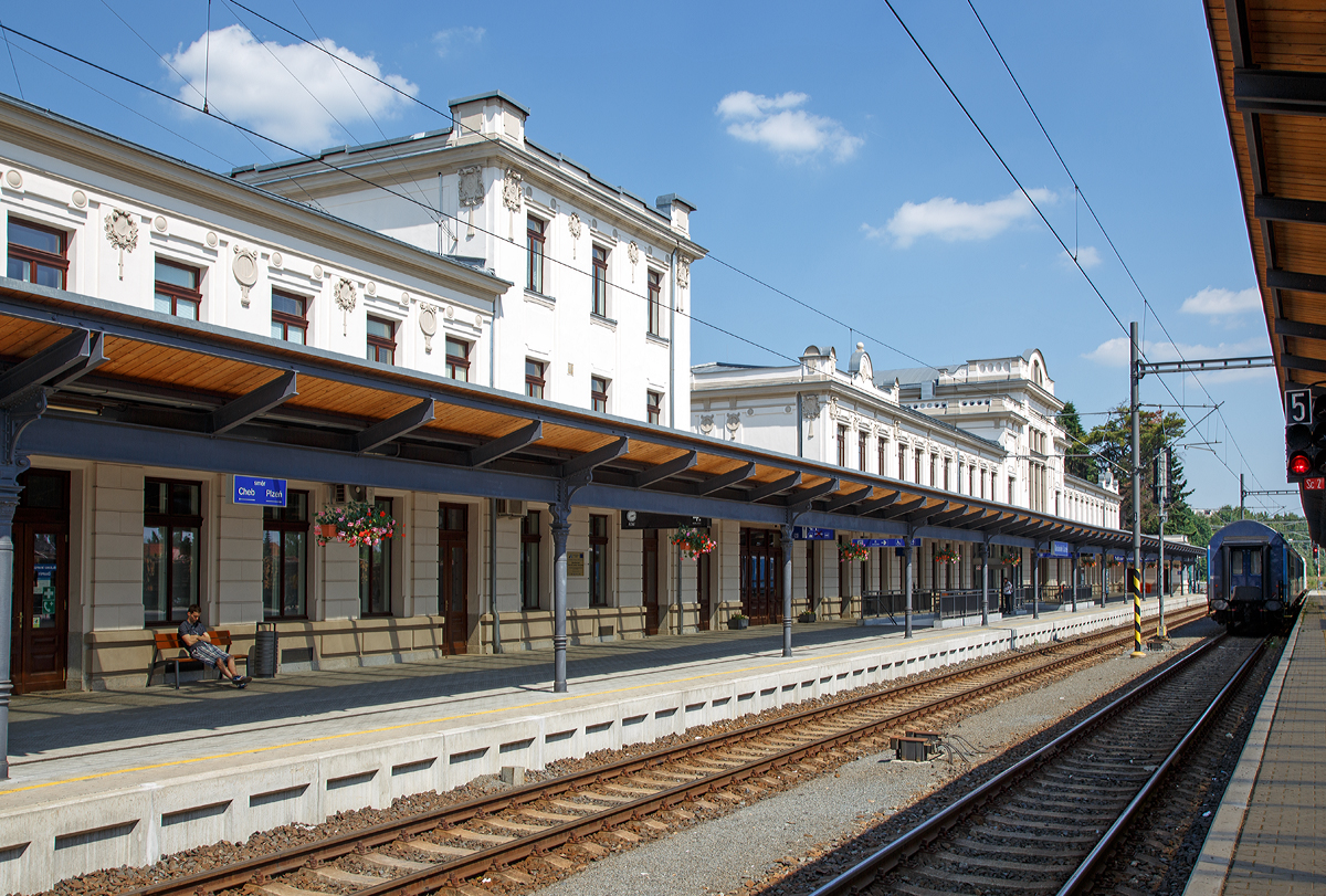 Das Empfangsgebäude vom Bahnhof Mariánské Lázně (deutsch Marienbad) von der Straßenseite am 01.07.2015.