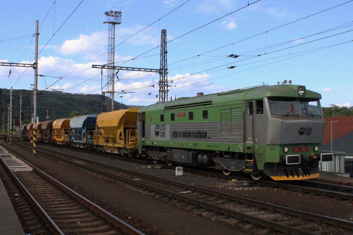 KDS 751 115 verlasst am Abend van 27 Mai 2025 Decin hl.n. mit ein Schotterzug.