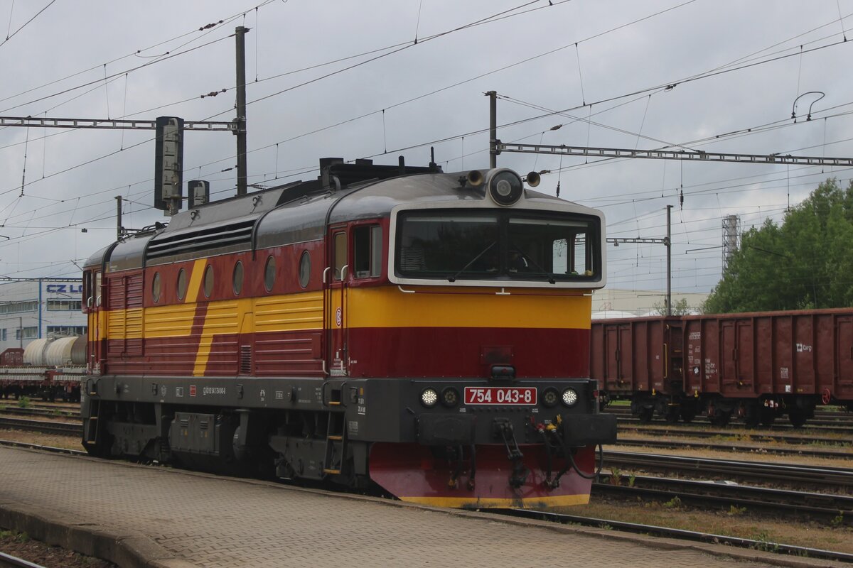 CD 754 043 steht am trüben Mitag von 28 Mai 2025 mit Quasi-Retrolackierung in Jihlava.