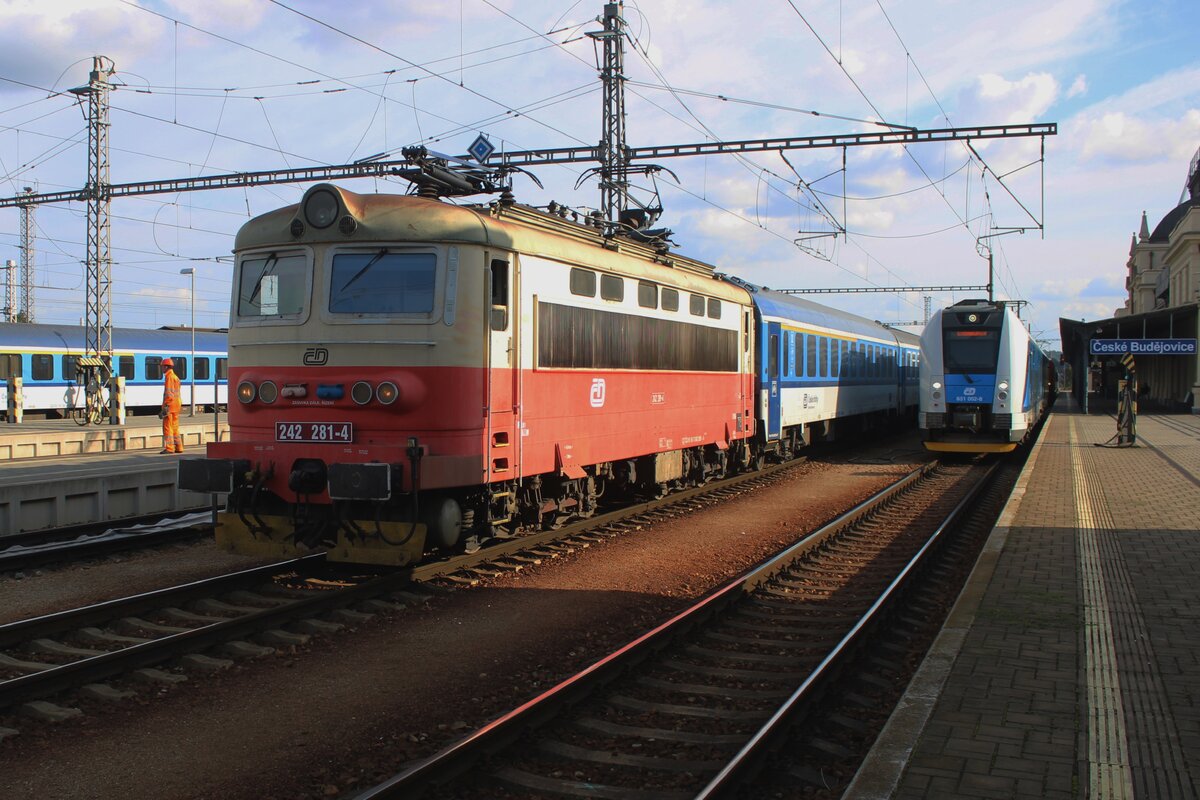 Altlack und Einbeinpantografen: CD 242 281 zieht am Abend von 28 September 2025 der Rychlyk nach Jihlava aus Ceske Budejovice.