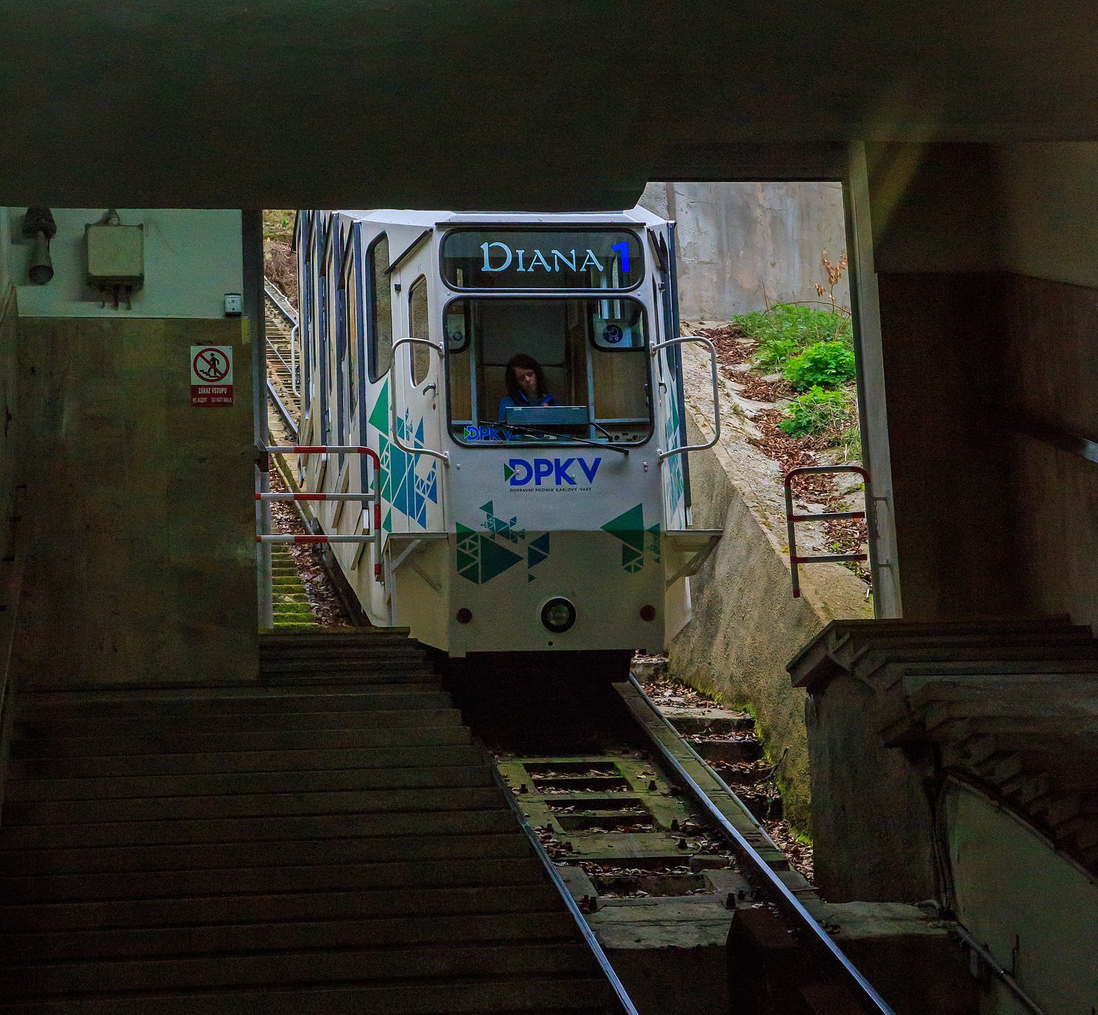 Wegweiser zur Talstation der Standseilbahn Diana (tschechisch Lanová dráha Diana) in Karlsbad (Karlovy Vary) am 18.04.2023.
