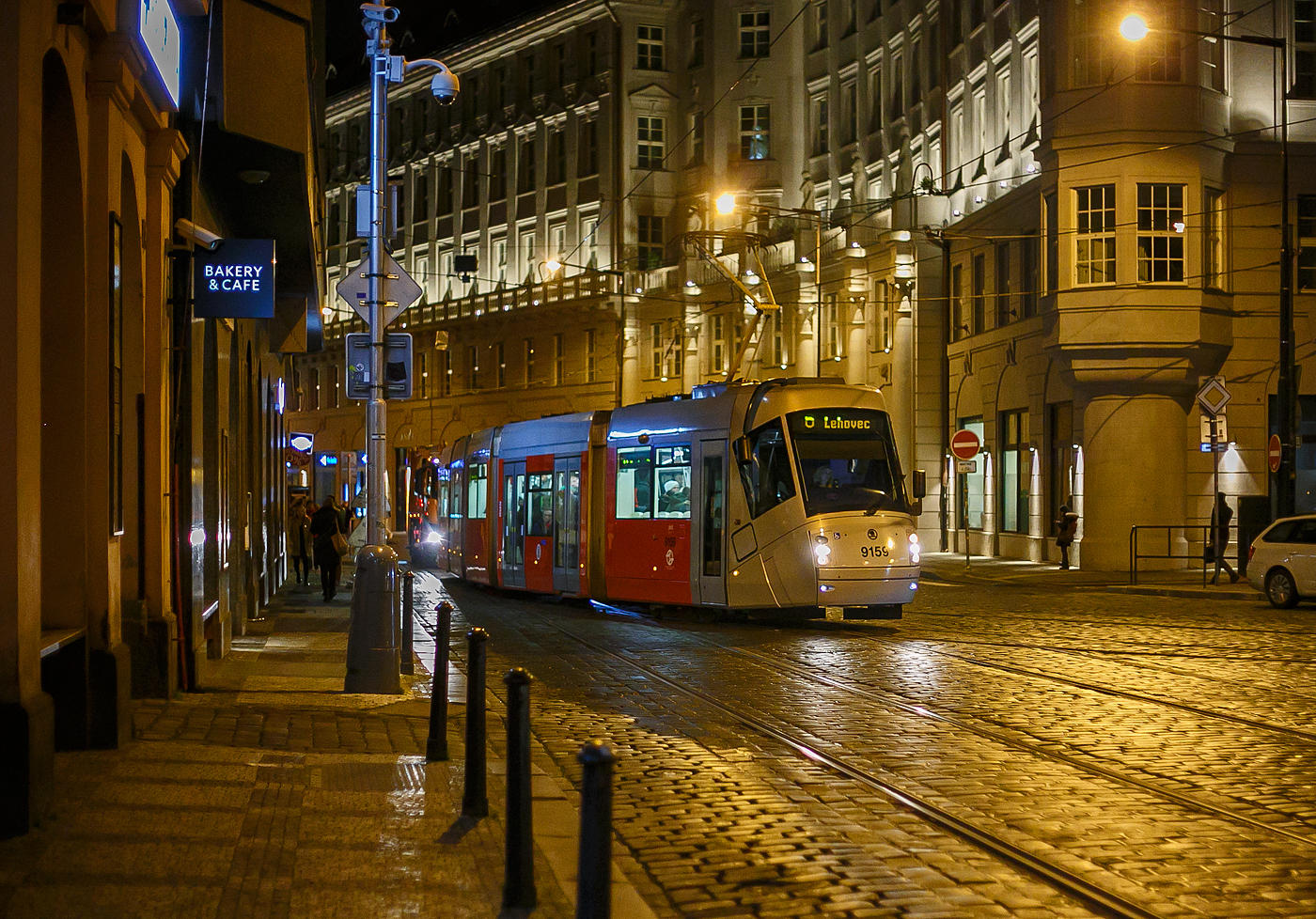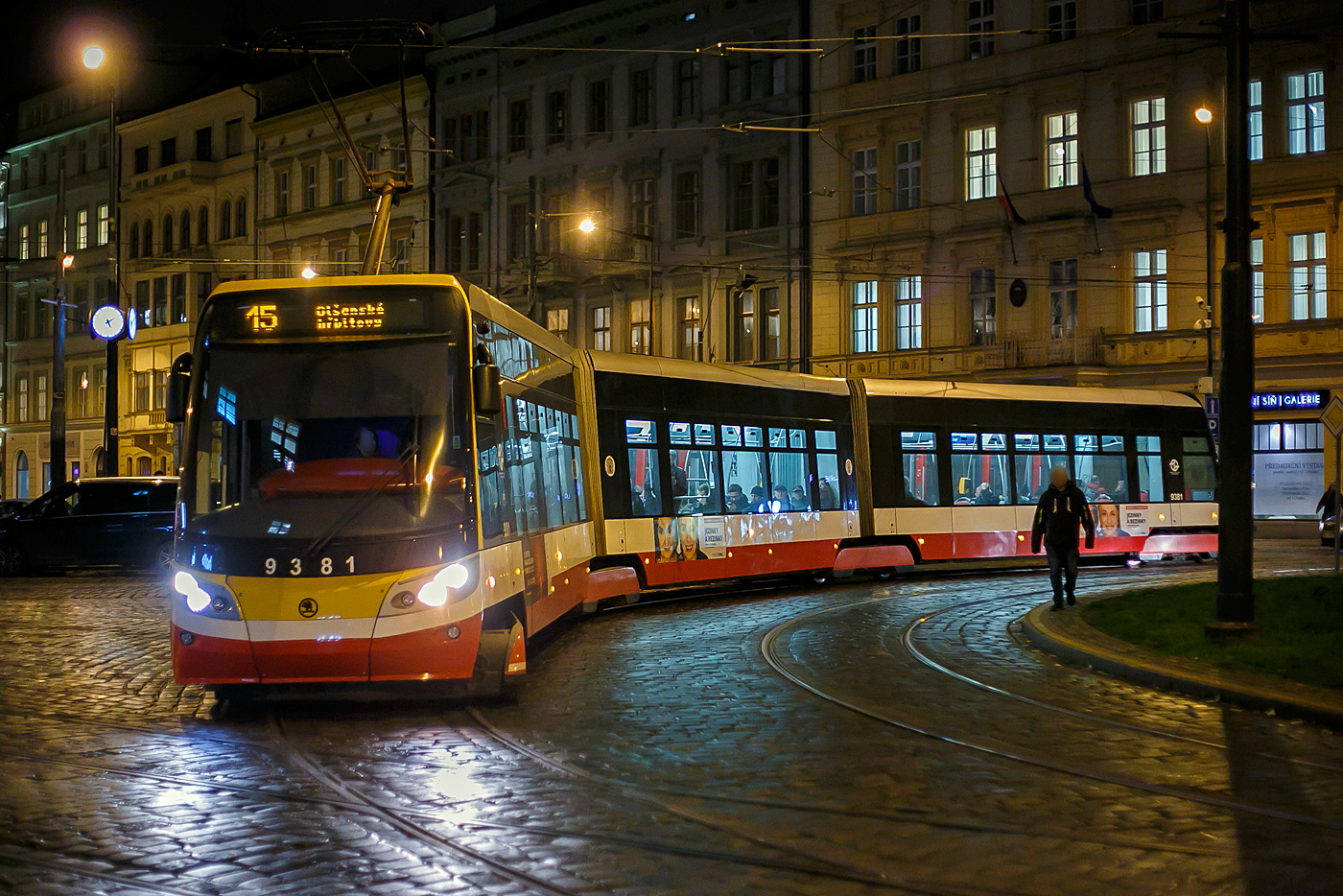 Straßenbahn Prag, der Triebwagen DPP 9410, ein dreiteiliger achtachsiger ¦koda 15T4 am 22.11.2022, als Linie 19, auf der Senová¸né náměstí Prag.