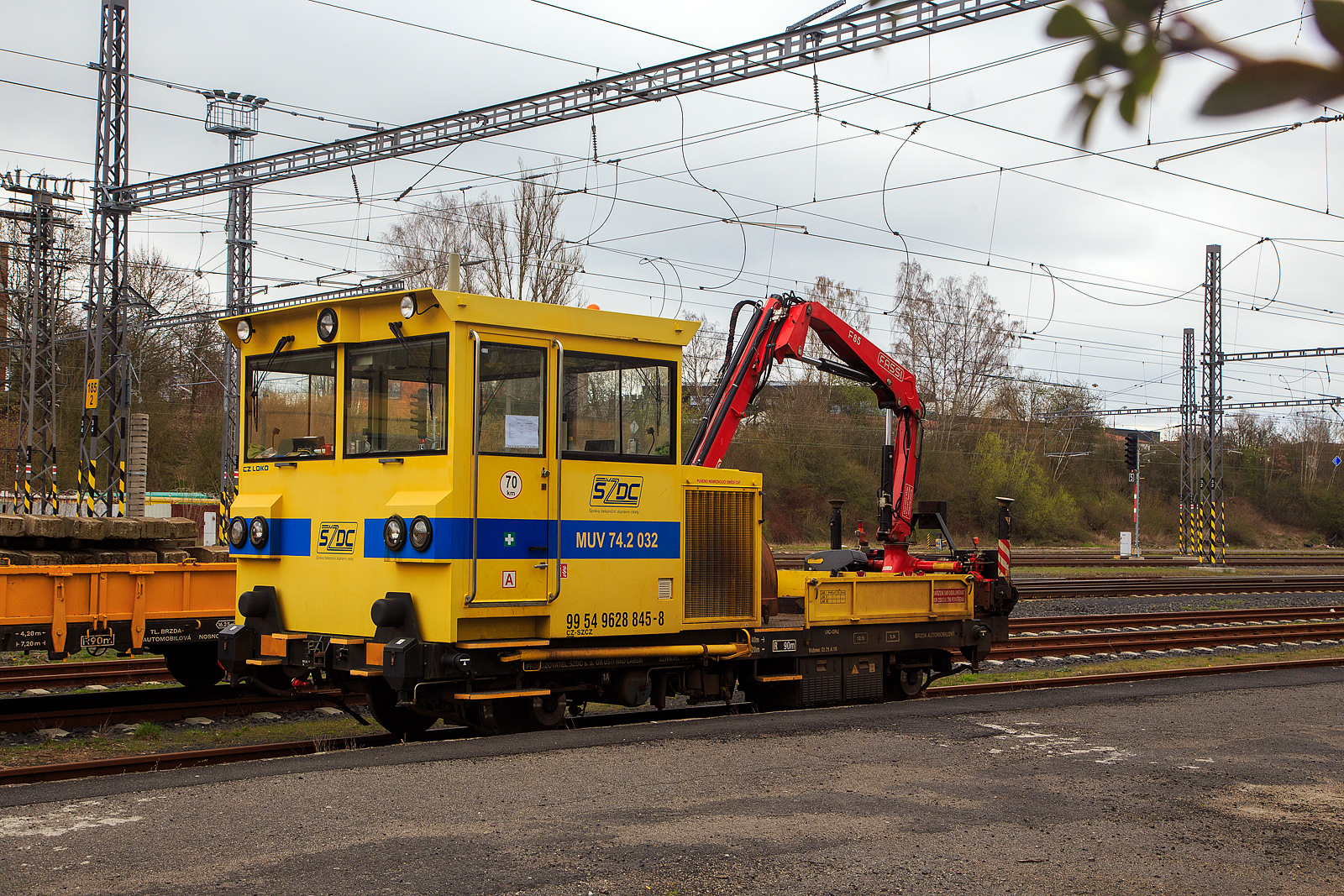 Der tschechischer zweiachsige Rottenwagen 99 54 9400 413-0 CZ-SŽCZ) der Správa železnic ist am 17 April 2023, mit dem Schwerlastkleinwagen mit Kran MUV 75 003 (99 54 9 628 859-9 CZ-SŽCZ) beim Bahnhof Františkovy Lázně (Franzensbad) abgestellt.