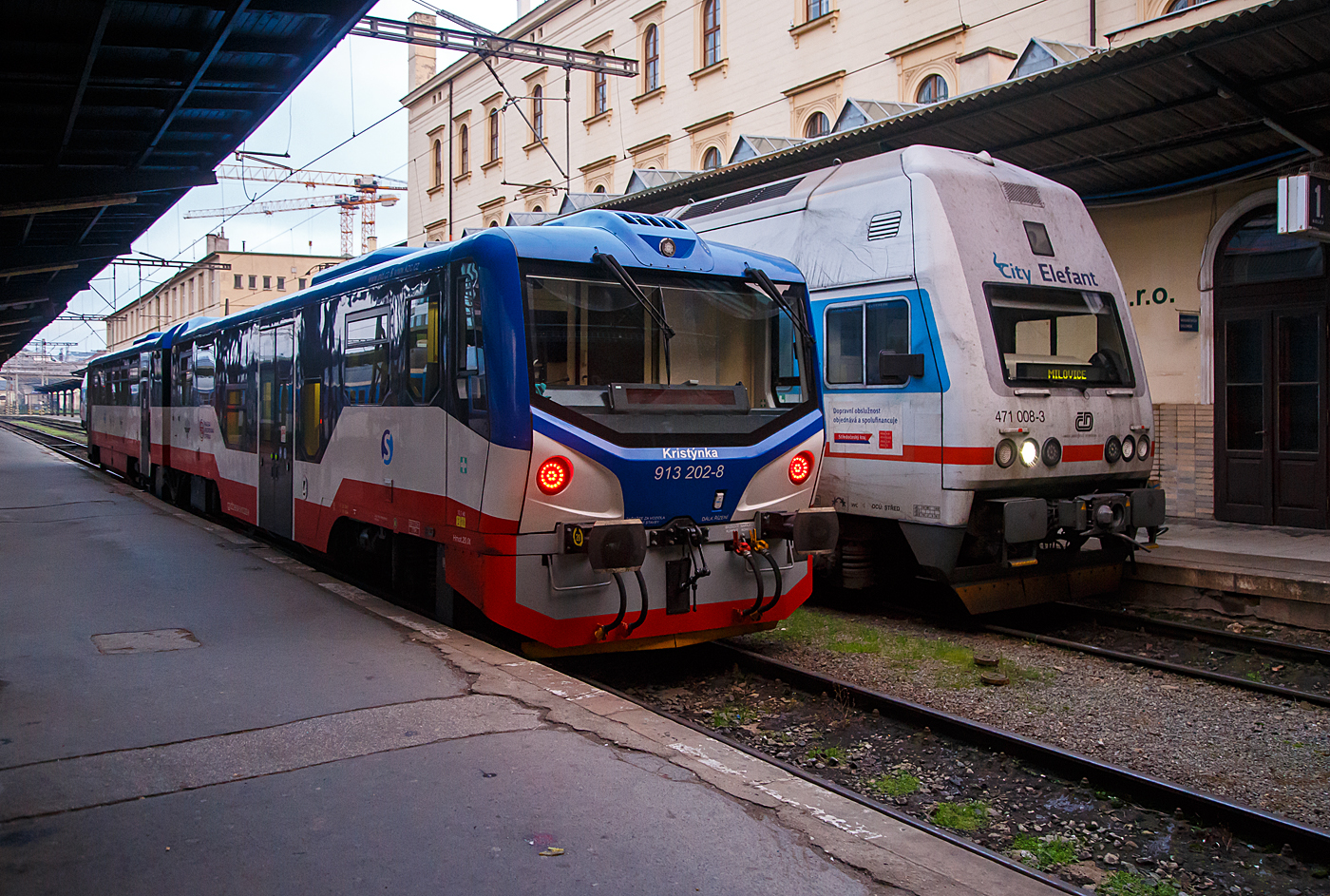 Der VT 813 202-9  / 913 202-8 „Kristýnka“ (Christine) (CZ-K´C 95 54 5 813 202-9 / CZ-K´C 95 54 5 913 202-8) der K´C Doprava (Klub ¸elezničních cestovatelů) steht am 23.11.2022, als S 34 Praha Masarykovo nádra¸í – Praha-Čakovice für die S-Bahn Prag (Esko Praha), im Bahnhof Praha Masarykovo nádra¸í (Prag Masarykbahnhof).