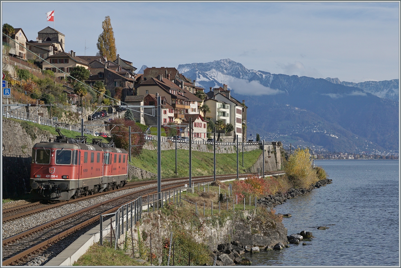 ein sehr schönes Bild von der normalspurigen Vectron AC mit dem Güterzug und dem schmalspurigen TPC Beh 2/6 546 "Les Doigts".